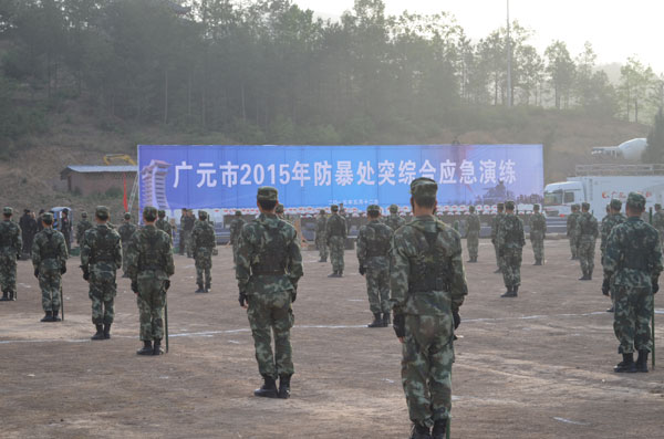 5月12日上午,由广元市人民政府应急办公室牵头主办的“广元市2015年防暴处突综合应急演练”在081电子工业园区举行。此次演练活动共分三个阶段:第一阶段为全民紧急逃生避险演练,第二阶段为特警、武警特战技能演示,第三阶段群体性事件处置演练。