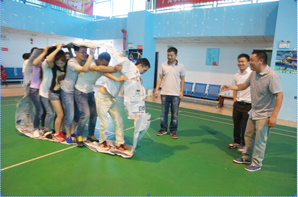 (图为员工以报纸为道具开展“同舟共济”娱乐游戏)