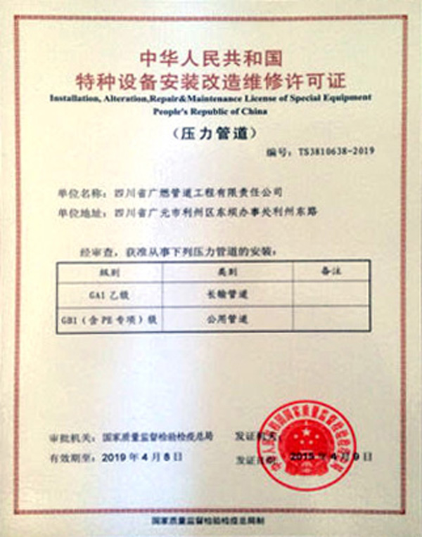 四川省广燃管道工程有限责任公司已具备压力管道安装资格