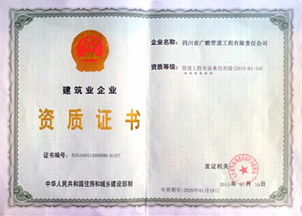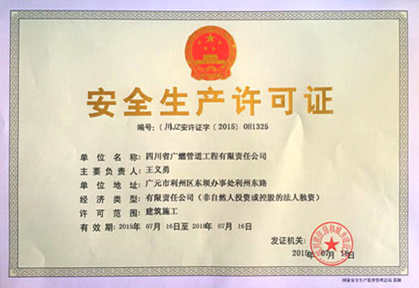 7月16日,经四川省住房和城乡建设厅核准,四川省广燃管道工程有限责任公司取得建筑施工《安全生产许可证》,自2015年1月和4月该公司分别取得《建筑业企业管道工程专业承包叁级资质》、中华人民共和国《特种设备安装改造维修许可证(压力管道)GA1乙级、GB1(含PE专项)》资质。在该公司成立一周年之际,四川省广燃管道工程有限责任公司已具备压力管道安装资格,对于公司拓展市场开展业务具有重要战略意义。