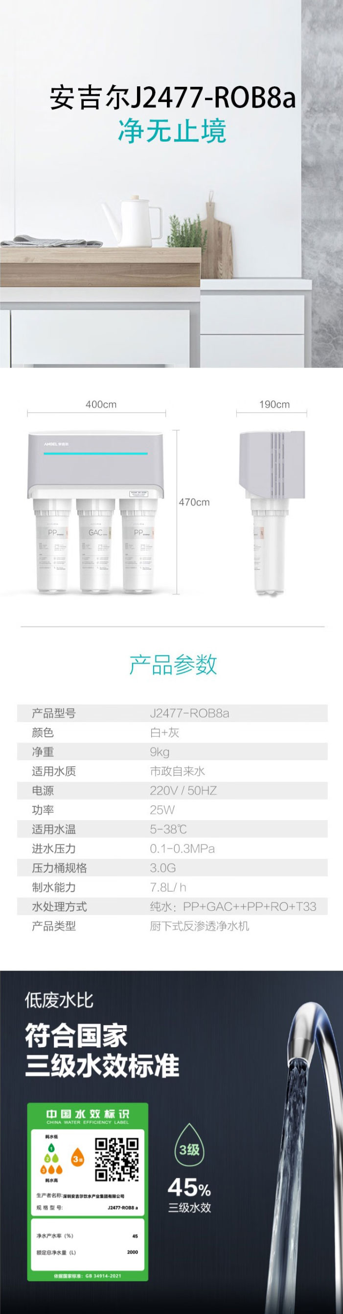 安吉尔(Angel)蒸馏水设备器家庭支出ZMD直饮厨下式反覆盖蒸馏水设备机J2477-ROB8a RO过滤清洁蒸馏水机